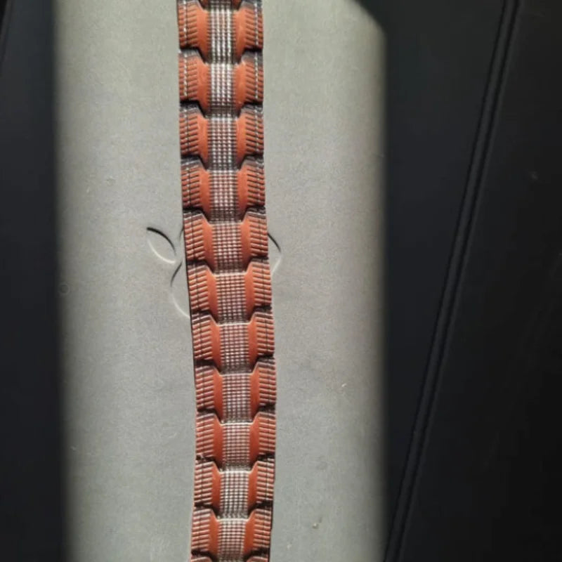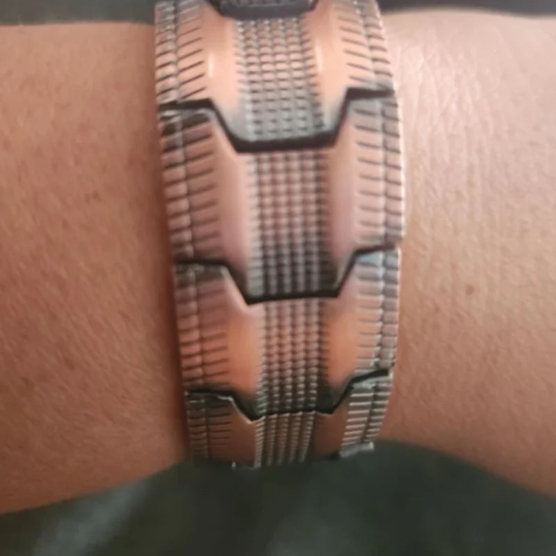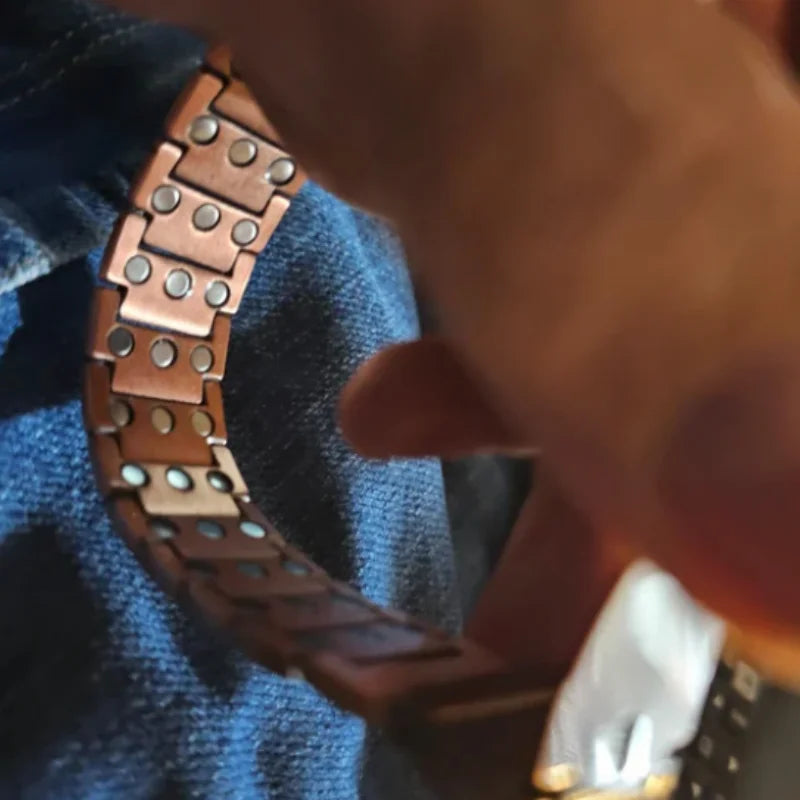 Le bracelet combine des aimants intégrés et un alliage de cuivre pour diffuser un champ magnétique doux, conçu pour accompagner le corps et favoriser une sensation de bien-être au quotidien.